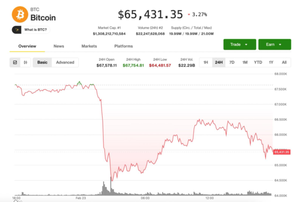 بيتكوين ( BTC) دولار تلاشى الارتفاع الطفيف للغاية الذي شهده سعر السهم عند 65,755.04 بعد موجة البيع الحادة التي شهدها خلال الليل، بسرعة خلال التداولات الصباحية الأمريكية يوم الاثنين، حيث تحولت أسواق المخاطر الأوسع نطاقاً إلى انخفاض حاد. تم تداول البيتكوين عند 65400 دولار قرب منتصف النهار على الساحل الشرقي، بانخفاض قدره 35% خلال الـ…