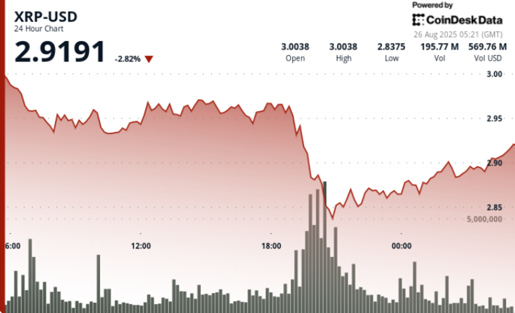 واجهت عملة XRP تقلبات حادة خلال فترة تداول يومي 25 و26 أغسطس، حيث انخفضت من 3.01 دولار أمريكي إلى 2.91 دولار أمريكي، مسجلةً خسارة بنسبة 3.2%. وأدى تدفق عمليات التصفية المؤسسية خلال الساعة 7:00 مساءً إلى 8:00 مساءً بتوقيت غرينتش إلى أكبر انخفاض، حيث تضاعفت أحجام التداول ثلاثة أضعاف متوسطاتها اليومية. وأعادت محاولات التعافي في أواخر الجلسة العملة إلى ما فوق 2.90 دولار أمريكي، لكن السوق لا يزال منقسمًا حول إمكانية استمرار الزخم الصعودي.