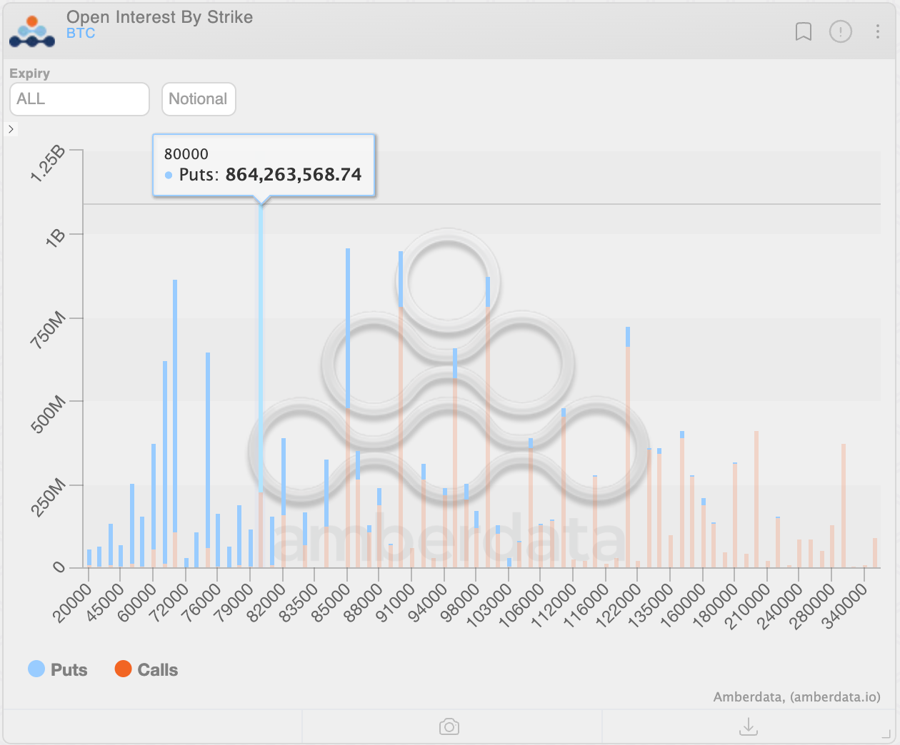 حتى كتابة هذه السطور، بلغ عدد المراكز المفتوحة لخيار البيع بقيمة 80,000 دولار أمريكي 10,278 عقدًا، أي ما يعادل حصة مفتوحة اسمية قدرها 864.26 مليون دولار أمريكي، وفقًا لمصدر بيانات Amberdata. وهذا يجعلها الخيار الأكثر شيوعًا على منصة Deribit، حيث يمثل العقد الواحد بيتكوين واحدًا.