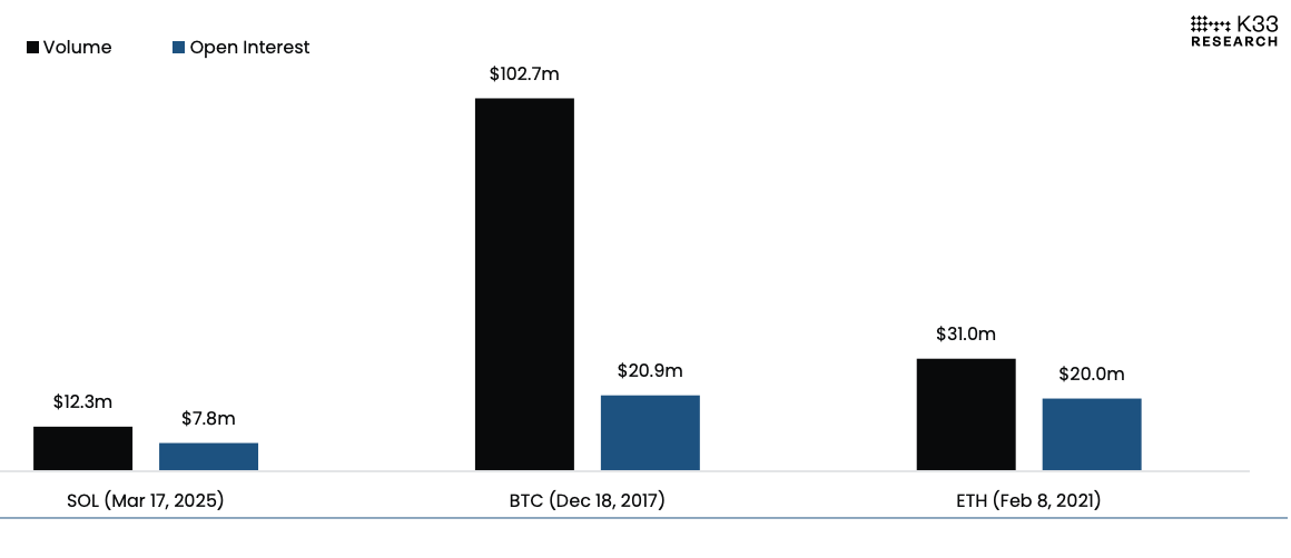 حجم التداول والفائدة المفتوحة في اليوم الأول لـ SOL وBTC وETH، مع تعديل القيمة السوقية. (K33 Research)
