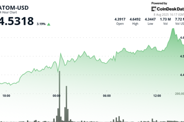 ارتفعت عملة ATOM بنسبة 4% من 4.36 دولار أمريكي إلى 4.55 دولار أمريكي خلال 24 ساعة حتى الساعة 3:00 مساءً بتوقيت UTC في 8 أغسطس، مخترقةً مستوى مقاومة رئيسيًا بحجم تداول استثنائي بلغ 2.19 مليون وحدة، متجاوزةً بذلك المتوسطات اليومية بكثير. وقد عزز هذا الارتفاع شراء المؤسسات المكثف لرموز منظومة Cosmos، وهي خطوة مرتبطة بإطلاق…
