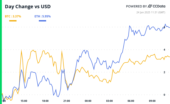 ارتفع سعر ETH بنسبة 4.96% عند 3,409.62 دولارًا (24 ساعة: +6.18%)